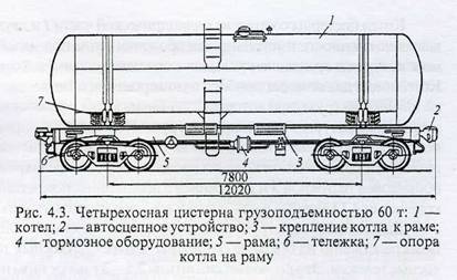 Четырехосная цистерна грузоподъемностью 60 т постройки Мариупольского (Ждановского) завода (рис. 4.3) имеет котел с полезной емкостью 71, 7 м³ полной емкостью 73, 1 м³ и с внутренним диаметром 3, 0 м.