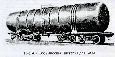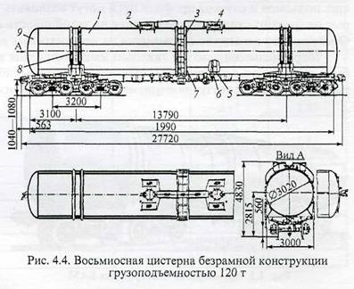 Крепление котла на раме производится в средней и в концевых его частях. К крайним опорам котел притянут стяжными хомутами, предназначенными для предотвращения вертикальных и поперечных его перемещений относительно рамы. Особенностью конструкции рамы цистерны модели 15-1443 является отсутствие боковых продольных балок, наличие мощных концевых балок и облегченных продольных боковых балок лишь по концам рамы. Отсутствуют также промежуточные поперечные балки. Вследствие этого масса тары цистерны уменьшилась на 1, 4 т. При такой конструкции силы, действующие на цистерну, воспринимаются котлом, жесткость которого значительно выше жесткости продольных боковых балок, и затем через крайние его опоры передаются на тележки. В последние годы на Уральском и Мариупольском вагоностроительных заводах строятся четырехосные цистерны с увеличенной базой (7, 8 м вместо 7, 12 м) и укороченными консолями (1, 5 м вместо 1, 84 м), что улучшает динамические качества цистерны, особенно в горизонтальной плоскости, и повысить безопасность движения грузовых поездов, в которых имеются такие цистерны. Для перевозки бензина спроектирована четырехосная цистерна с удельным объемом котла 1, 4 м³ /т, вписанная в габарит 02-ВМ, что позволяет эксплуатировать ее на зарубежных железных дорогах с шириной колеи 1435 мм. Грузоподъемность такой цистерны 62 т, масса тары 25, 3 т, осевая нагрузка 216 кН, погонная нагрузка 64 кН/м. В последние годы постройка четырехосных цистерн с улучшенными технико-экономическими показателями производится на Уралвагонзаводе и на других предприятиях России. Для увеличения провозной способности железных дорог Мариупольским заводом тяжелого машиностроения (Азовмаш) совместно с кафедрой «Вагоны и вагонное хозяйство» Московского института инженеров железнодорожного транспорта (ныне Московский государственный университет путей сообщения — МИИТ) создана восьмиосная цистерна безрамной конструкции модели 15-871. У нее отсутствуют хребтовая балка между шкворневыми узлами и продольные боковые балки. Грузоподъемность 120 т (рис. 4.4). Увеличенный до 1, 14 м³ /т удельный объем котла позволяет лучше использовать грузоподъемность цистерны, а повышенная до 80 кН/м погонная нагрузка позволяет увеличить на 30—35 % массу поезда при существующих ограничениях его длины и тем самым достичь большей провозной способности железных дорог, сократить капитальные вложения на развитие пропускной способности, снизить себестоимость перевозок, увеличить производительность труда.