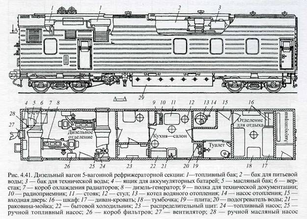 Охлажденный или подогретый воздух нагнетается в грузовое помещение вентиляторами, размещенными в холодильных агрегатах, подается в пространство над промежуточным потолком 20 и отсюда распределяется по грузовому помещению. Для отвода воздуха из вагона имеются два потолочных дефлектора 18 с заслонками, открывающимися или закрывающимися с помощью рычагов 17 из машинных отделений. Промывочные воды и конденсат отводятся через четыре сливных прибора 19.