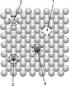 Двумерная модель кристалла с простейшими собственными и примесными дефектами: 1 - вакансия; 2 - межузельный атом; 3 - примесь внедрения; 4 - примесь замещения