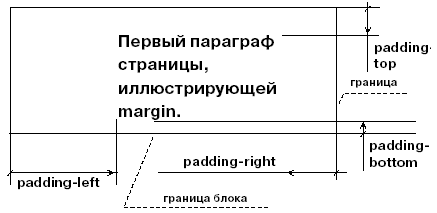 Для этого примера при описании параграфа использовался стиль: P { padding-left: 100px; text-align: left; border-width: 1px; }Чтобы браузер правильно отображал стили, не следует размещать описание стиля на нескольких строчках, как это сделано в примере. Для Internet Explorer это не имеет значения, а Netscape Navigator может " споткнуться". У блока текста существует четыре стороны. Соответственно, padding может быть: padding-left — левый внутренний отступ, который определяет расстояние от левого края блока до его содержания; padding-right — правый внутренний отступ, который определяет расстояние от правого края блока до его содержания; padding-top — верхний внутренний отступ, который определяет расстояние от верхнего края блока до его содержания; padding-bottom — нижний внутренний отступ, который определяет расстояние от нижнего края блока до его содержания; padding — определяет единый размер внутреннего отступа блока. Этот параметр задается в случае одинакового размера отступа от всех сторон блока. Проиллюстрируем применение padding на примере:
