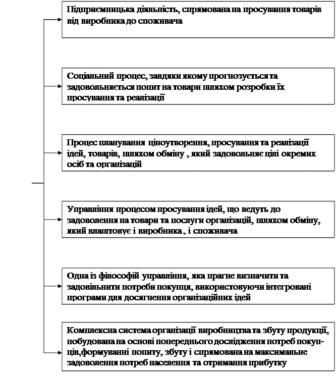 Спеціалістам з галузі менеджменту відомо, що визначень маркетингу – десятки і їх число множиться. На рис. 1. наведено шість найпоширеніших з них. Американська асоціація маркетингу (АМА) з 1985р. Визначення маркетингу трактує так: „ Маркетинг –це процес планування і втілення задуму щодо ціноутворення, просування і реалізації ідей, товарів та послуг шляхом обміну, який задовольняє цілі окремих осіб та організацій.” Із наведеного визначення можна судити про те, що до сфери маркетингової діяльності входять питання розробки нових ідей, товарів, послуг, їхня вартісна оцінка залежно від попиту, процес просування до споживачів, кожний з яких має свої запити, вимоги, потреби. Маркетинг (ринок) є складовою частиною ринкової концепції, яка характеризується сукупністю економічних відносин між продавцями та покупцями, наявністю попиту і пропозицій на товари, послуги та ідеї. Маркетинг - це система різних видів діяльності підприємства, що пов’язані між собою і охоплюють планування, ціноутворення, продаж, доставку товарів та надання послуг, в яких є потреба у існуючих або постійних споживачів. Маркетинг та ринок характеризуються такими вихідними поняттями, як: Бажання – почуття людини, групи людей спричинене нестачею чогось, форма виявлення потреб. Потреба – нужда в чомусь об’єктивно необхідному для підтримки життєдіяльності і розвитку організму особи, соціальної групи, Попит – суспільна або особова потреба в матеріальних благах і цілях, у засобах виробництва і предметах споживання, забезпечена купівельною здатністю, тобто, грошовими засобами покупця. Товар – продукт праці, властивості якого задовольняють потреби покупця. Обмін – процес отримання однією стороною від другої товару, послуги, ідеї із зустрічною пропозицією, яка б задовольняла сторону-продавця. Угода – комерційний обмін товарами, послугами між двома організаціями або юридичними особами. Ринкикласифікуються за типами: 1. за обсягом та межами його охоплення – галузева незалежність обсягів обміну в масштабах країни, регіональна галузева незалежність товару, 2. за галузевою незалежністю товару як об’єкта обміну – ринок автомобілів, ринок чорних металів, ринок сировини, тощо 3. за характером та рівнем попиту і пропозиції на ринку – ринок продавця, ринок покупця 4. за характером взаємин між продавцем та покупцем – вільні, замкнуті, регульовані 5. за методами та об’єктами товарного обміну – посередницький ринок, товарна біржа, аукціон, торги, методи прямі та опосередковані, 6. за характером об’єкта товарного обміну – ринок товарів та послуг, ринок капіталу, ринок робочої сили, ринок фінансовий(цінних паперів, кредитний, валютний) 7. за відношенням до контрольних меж сфери обміну –внутрішній (місцевий), зовнішній (іноземний), 8. за сферою міжнародного товарного обміну та галузевою належністю об’єкта обміну – світовий товарний ринок зерна, світовий ринок кольорових металів, тощо. До сфери маркетингової діяльності входять питання розробки нових ідей, товарів, послуг, їхня вартісна оцінка в залежності від попиту, процес просування до споживачів, кожний з яких має свої запити, вимоги та потреби. Тобто, маркетинг визначається як- вид людської діяльності, спрямованої на задоволення потреб через обмін. Основою або своєрідним Олімпом маркетингової діяльності - є потреби спожив