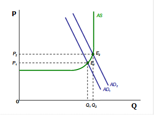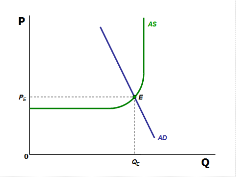 Рис. 2.3. Равновесие в модели AD–AS Смещение кривой AD приводит к различным последствиям в зависимости от того, на каком отрезке кривой AS оно происходит. Эффект храповика – сочетание тенденции уровня цен к повышению в случае возрастания совокупного спроса и тенденции к сохранению стабильности в случае снижения совокупного спроса; это объясняется неэластичностью заработной платы и рыночной властью крупных фирм.