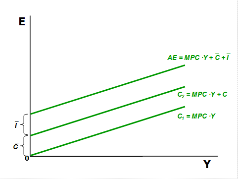 Модель доходов и расходов: · разработана кейнсианской школой экономической теории; · предполагает, что в равновесной экономике все доходы должны расходоваться (Y = AE); · показывает зависимость национального дохода и занятости от совокупных расходов (эффективного спроса). Совокупные расходы рассматриваются в модели «доходы – расходы» как сумма двух компонентов: · потребительские расходы; · инвестиции. AE = C + I Потребительские расходы: · являются функцией от величины дохода потребителя (доход – эндогенный фактор потребления): C = f (Y) · при данном уровне дохода зависят от склонности потребителя к потреблению или к сбережению: Y = C + S · помимо величины дохода, зависят от ряда автономных (экзогенных) факторов ( Основной психологический закон состоит в том, что люди склонны, как правило, увеличивать своё потребление с ростом дохода, но не в той же мере, в какой растёт доход.