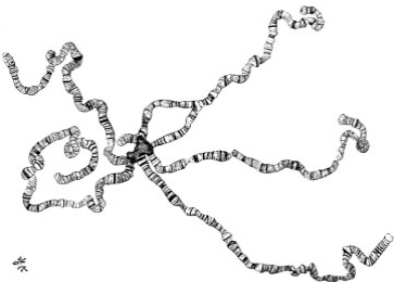 Рис. 3. Політенні хромосоми Drosophila melanogaster. Кожна батьківська хромосома зкон’югована зі своїм гомологом (соматичний синапсис). Є райони де дві хромосоми лежать окремо (асинапсис). Всі хромосоми зв’язані центромерними районами в спільний хромоцентр. Знизу зліва мітотичні хромосоми із клітин яєчників при тому ж збільшенні (2n=8).