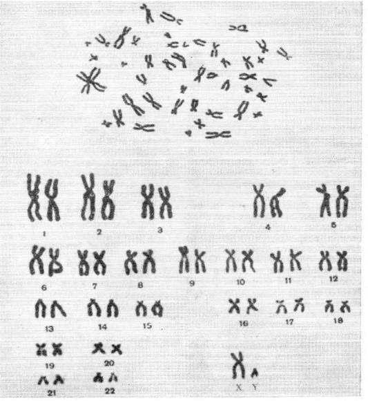 Генетика людини (антропогенетика) — це розділ генетики, який вивчає спадковість і мінливість у людини. Людина є складовою частиною біосфери і продуктом її еволюції, тому закономірності біологічних процесів, які мають універсальне значення, в повній мірі стосуються і людини. Отже, закономірності спадковості і мінливості можна повністю перенести на людину та її популяції. В той же час, вивчення спадковості і мінливості у людини пов’язано з рядом труднощів, а саме: з неможливістю направлених схрещувань для генетичного аналізу та експериментального одержання мутацій; пізнім статевим дозріванням; малою кількістю потомства; неможливістю забезпечення однакових і строго контрольованих умов для розвитку нащадків від різних шлюбів; недостатньою точністю реєстрації спадкових ознак і невеликих родоводів; наявністю в каріотипі порівняно великого числа (2n=46) хромосом, що погано різняться. Все це змушує шукати нетрадиційні шляхи та методи наукових досліджень генетики людини. Основними методами генетики людини є генеалогічний, близнюковий, цитогенетичний, біохімічний, популяційно-статистичний, онтогенетичний, імунологічний. Всі вони відбивають її особливості як генетичного об'єкта. Цитогенетичний метод дає можливість вивчити будову хромосом і каріотип людини в цілому. Каріотип — повний набір хромосом соматичної клітини, який характеризується певною кількістю, величиною та формою хромосом для кожного виду організмів. Основні методи цитогенетики: каріотипування і визначення статевого хроматину. Каріотипування — вивчення каріотипу в соматичній клітині. Каріотип людини найчастіше досліджують у лімфоцитах периферичної крові. Для цього венозну кров центрифугують, виділяють лейкоцити. Потім їх вміщують у спеціальне поживне середовище з фітогемаглютиніном (ФГА), який стимулює поділ одного з видів лейкоцитів — лімфоцитів. Суспензію витримують у термостаті протягом 72 год. За 3 год до кінця інкубації додають колхіцин. Колхіцин затримує поділ лімфоцитів на стадії метафази. Потім до культури лімфоцитів додають гіпотонічний розчин КСl, в якому клітини збільшуються в об'ємі, а хромосоми з області екватору розподіляються по всій клітині. Препарат забарвлюють ядерними барвниками і вивчають у світловому мікроскопі з імерсійним об'єктивом. Сукупність хромосом одного лімфоцита на стадії метафази називають метафазною пластинкою. Метафазну пластинку можна також сфотографувати і вивчити кількість і форму хромосом на мікрофотографії. У соматичній клітині здорової людини 46 хромосом (44 аутосоми і 2 статеві хромосоми) (Див. Рис. 9.). Хромосомний набір жінки можна записати як 46, XX, а чоловіка — 46, ХY. Для ідентифікації хромосом людини запропонована Денверська Міжнародна класифікація (1960), за якою всі хромосоми розподіляються попарно на 7 груп у порядку зменшення розміру (А — 1, 2, 3 пари; В — 4, 5 пари; С — 6, 7, 8, 9, 10, 11, 12; D —13, 14, 15; E —16, 17, 18; F — 19, 20; G — 21, 22). Статеві хромосоми X і Y виділяють окремо. Рис. 9. Хромосомний набір чоловіка. Метафаза і каріотип