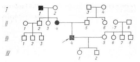 На рис. 11 наведено приклад родоводу сім’ї, в якій зустрічається природжена катаракта. У родоводі усіх представників одного покоління позначають умовними символами в одному рядку. Покоління нумерують римськими цифрами зліва зверху вниз. Усіх членів одного покоління нумерують зліва направо арабськими цифрами. Для позначення родинних зв'язків між членами родоводу застосовуються наступні знаки. Горизонтальна лінія, що з'єднує коло з квадратами - лінія шлюбу. Від неї відходить графічне «коромисло», до якого прикріплені знизу діти, які народилися від цього шлюбу. Близнята позначаються поряд розташованими фігурами (колами, квадратами), підвішеними до однієї точки коромисла. Одружені діти з'єднуються лініями шлюбу зі своїми подружжями. Щоб позначити, що в подружньої пари було декілька дітей, ставлять ромб з цифрою всередині. Ця цифра означає число дітей.