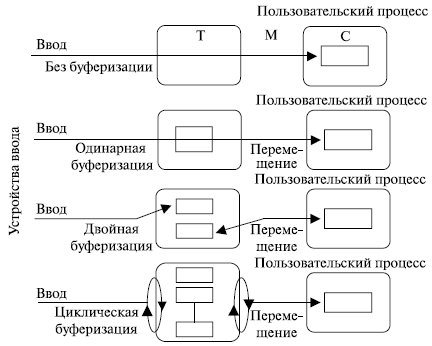 При обмене данными всегда возникает задача согласования скоростей работы устройств. Решение этой задачи достигается буферизацией данных [10, 17]. В подсистеме ввода-вывода часто используется буферизация в оперативной памяти. Однако буферизация только на основе оперативной памяти часто оказывается недостаточной из-за большой разницы скоростей работы оперативной памяти, и внешнего устройства объема оперативной памяти может просто не хватить. В этих случаях часто используют в качестве буфера дисковый файл, называемый спул-файлом. Типичный пример применения спулинга – вывод данных на принтер (для печатаемых документов объем в несколько Мбайт – не редкость, поэтому временное хранение такого файла в течение десятков минут в оперативной памяти нецелесообразно). Другим решением проблемы является использование большой буферной памяти в контроллерах внешних устройств. Такой подход полезен в тех случаях, когда помещение данных на диск слишком замедляет обмен (или когда данные выводятся на сам диск). Например, в контроллерах графических дисплеев применяется буферная память, соизмеримая по обмену по обмену с оперативной памятью, и это существенно ускоряет вывод графика на экран. При рассмотрении различных методов буферизации нужно учитывать, что существует, как отмечалось, два типа устройств – блочные и символьные. Первые сохраняют информацию блоками фиксированного размера и передают поблочно (диски, ленты). Вторые выполняют передачу в виде неструктурированных потоков байтов (терминалы, принтеры, манипулятор мыши, сканеры и др.). Возможные схемы буферизации ввода-вывода приведены на рис. 7.3.