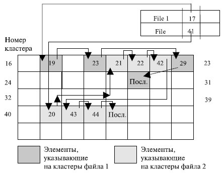 Первые две записи FAT зарезервированы и содержат информацию о самой FAT, все остальные указывают на соответствующие кластеры диска. Индексный указатель принимает значение, характеризующее состояние связанного с ним кластера (для FAT 16):