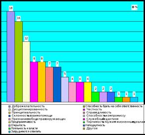Так как одним из факторов эффективности профессиональной деятельности является высокий уровень культуры служащих были выявлены основные элементы этикета. На вопрос «Какими элементами этикета необходимо обладать госслужащему?» – ответы расположились следующим образом как на рисунке. Как видим, в число главных элементов этикета чиновников вошли, прежде всего, такие ценности, как доброжелательность, способность брать на себя ответственность, дисциплинированность, а затем уже называются честность, принципиальность, справедливость и др. Только на 12–14-м местах неподкупность. Основные особенности профессиональной этики сотрудника МЧС отражены в Кодексе этики.