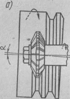Рис. 11. Схемы фрезерования резьбы дисковыми фрезами: а — смещение осей фрезы и нарезаемой детали; б — фреза симметричного профиля; в — фреза несимметричного профиля. резании резьбы фреза вращается и имеет поступательное движение вдоль оси детали, причем перемещение за один оборот детали должно точно соответствовать шагу резьбы. Вращение детали происходит медленно в соответствии с подачей. Время нарезания для каждого прохода определяется отдельно, так как глубина резания, минутная подача и врезание для каждого из них различны. Второй способ — фрезерование групповой фрезой — применяется для получения коротких резьб с мелким шагом (рис. 12, a — фрезерование наружной резьбы, рис. 12, 6 — фрезерование внутренней резьбы). Групповая фреза (называется иногда гребенчатой) представляет собой как бы группу дисковых фрез, собранных на одну оправку. Длина фрезы обычно принимаетсяи на 2—5 мм больше длины фрезеруемой резьбы. Групповая фреза устанавливается параллельно оси детали, а не под углом, как дисковая.