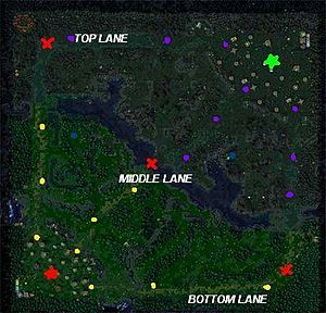 Общая карта DotA. Жёлтым и фиолетовым указано местоположение башен Sentinel и Scourge соответственно. Красной звездой помечена база Sentinel, зелёной — Scourge. Кроме того, указаны названия тропинок: верхняя, центральная и нижняя. КРИПЫ. С каждой из баз каждые 30 секунд по трём тропинкам (верхняя, центральная и нижняя) идут управляемые компьютером существа — «кри́ пы», которые сталкиваются между собой около середины тропинки. За убийство вражеских крипов игрок получает опыт, а нанесший последний удар — ещё и небольшую сумму денег. Весь начальный этап игры построен вокруг убийства вражеских крипов и попыток помешать противнику делать то же: можно нанести последний удар союзному крипу, не дав таким образом добить его противнику. Крипы становятся сильнее, если разрушена часть вражеской базы. Ещё один тип существ, участвующих в игре, — нейтральные крипы. Эти существа периодически появляются в лесу на каждой стороне карты в строго определённых местах (лагерях). Нейтральные крипы контролируются компьютером и не принадлежат ни к одной стороне. Днём они нападают на всех, кто находится рядом с ними, а ночью засыпают. Нейтральные крипы бывают как очень слабыми, так и достаточно сильными и за их убийство герой получает разное количество золота и опыта. Самым сильным нейтральным крипом является Рошан, выступающий своеобразным боссом в игре; запас его здоровья, наносимый урон и защита увеличиваются с течением времени.