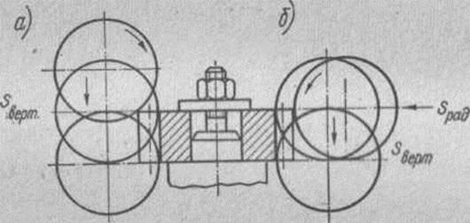 Рис. 5. Врезание червячной фрезы: а — осевое; б — радиальное Врезание червячных фрез, особенно больших диаметров, является значительной величиной и вызывает существенную затрату времени работы станка. Сократить это время на 20—30% можно заменой обычного осевого врезания (рис. 5, а) радиальным (рис. 5, б). Для повышения точности зубофрезерования и чистоты обработанной поверхности, а также увеличения стойкости червячной фрезы рекомендуется в процессе резания перемещать червячную фрезу вдоль оси из расчета 0, 2 мм за один оборот ее. Современные станки имеют специальное устройство для осевого перемещения фрезы. Это перемещение может осуществляться: 1) после нарезания определенного числа колес; 2) после каждого цикла зубофрезерования, во время смены заготовок; 3) непрерывно при работе фрезы. В последнем случае происходит диагональная подача фрезы как результат сложения движения подач вдоль оси заготовки и вдоль собственной оси фрезы. При нарезании червячных зубчатых колес ось фрезы устанавливается пер- пендикулярно оси обрабатываемого колеса и точно по центру ее ширины. Нарезать червячные зубчатые колеса можно: 1) способом радиальной подачи; 2) способом тангенциальной подачи; 3) комбинированным способом.