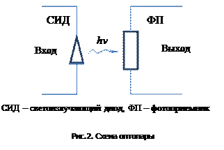 Переходы электронов из зоны проводимости в валентную зону сопровождаются выделением энергии Еg = hν (Еg – ширина запрещенной зоны). У многих полупроводников такой процесс рекомбинации электронно-дырочных пар носит преимущественно безызлучательный характер: выделяющаяся энергия отдается решетке и в конечном счете превращается в тепло. Однако у некоторых полупроводников рекомбинация может быть в значительной мере излучательной, когда энергия при рекомбинации выделяется в форме квантов света – фотонов. В условиях теплового равновесия число актов излучательной рекомбинации равно числу актов поглощения квантов света равновесного теплового излучения. Поэтому полупроводник излучает ровно столько света (и на тех же частотах), сколько поглощает из окружающего пространства. Для того чтобы излучение преобладало над поглощением, необходимо создать избыточную (над равновесной) концентрацию электронно-дырочных пар. Наиболее просто это можно сделать, используя явление инжекции носителей через р-n -переход при пропускании через него прямого тока. Концентрация неосновных носителей у границ р-n -перехода при этом резко повышается и становится значительно выше равновесной. К инжектированным неосновным носителям подтягиваются основные носители, и их концентрация у границ перехода становится также выше равновесной. Диффундируя в глубь полупроводника, неравновесные носители рекомбинируют, проникая в среднем на расстояние диффузионной длины от слоя объемного заряда р-n -перехода. Если при этом существенная доля актов рекомбинации происходит с излучением света, то, создав условия для выхода этого света наружу, полупроводниковый диод можно использовать как источник излучения. Такой диод называют светодиодом. Светодиоды в электронной технике часто используются в качестве малогабаритных световых индикаторов. Выбирая для светодиодов полупроводники с различной шириной запрещенной зоны, можно получать различный цвет свечения диода. Оптопары (оптронные пары) Если в одном блоке конструктивно объединить светодиод и фотоприемник, то полученный прибор принято называть оптопарой. На рис.2 схематически представлена оптопара.