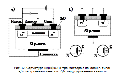Планарная технология получения МДП-транзисторов со встроенным каналом n-типа заключается в том, что на толстой высокоомной (полуизолирующей) подложке кремния p-типа создается тонкий (0, 1- 0, 5 мкм) слаболегированный слой n-типа – будущий канал. Затем всю поверхность окисляют, а в слое оксида, с помощью фотолитографии и травления делают " окна" под исток и сток. Через эти окна производится дополнительное легирование (например, методом диффузии) для создания высоколегированных областей n+-типа (рис. 4а). Затем на поверхность напыляют тонкую металлическую пленку для формирования выводов: истока, стока и затвора. На рис. 12, а видно, что канал соединяет высоколегированные области n+-типа: исток и сток. Т.к. высоколегированные области относительно низкоомны, то снижается бесполезное падение напряжения и потери мощности в этих областях. Третий вывод – затвор, отделен от полупроводника слоем диэлектрика (рис. 12), в нашем случае оксидом кремния. На рис. 12, б показана структура МДП-транзистора с индуцированным каналом, который возникает только при подаче электрического поля.