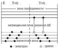 Собственные полупроводники – это химически чистые полупроводники (например, 4-валентные Si, Ge, 6-валентный Se) или химические соединения (GaAs, CdS и др.). Собственной проводимостью полупроводника называется проводимость, обусловленная носителями, образовавшимися вследствие перехода электронов из валентной зоны в зону проводимости. При температуре, близкой к абсолютному нулю, все уровни в валентной зоне полностью заполнены, а в зоне проводимости – свободны, и полупроводник по свойствам близок к диэлектрику. Повышение температуры приводит к тому, что часть электронов из валентной зоны переходит в зону проводимости; каждый такой электрон оставляет после себя в валентной зоне свободное место – “дырку”, рассматриваемую как эквивалентный электрону положительный заряд (