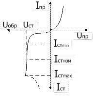 Стабилитрон - полупроводниковый диод, предназначенный для стабилизации, то есть поддержания неизменным, уровня постоянного напряжения. На его вольтамперной характеристике имеется участок, где напряжение почти не зависит от величины протекающего тока. Таким является участок электрического пробоя, где ток изменяется в широком диапазоне, не допускающем перехода в необратимый тепловой пробой. Так как участок электрического пробоя – это обратное напряжение, то стабилитрон работает на обратной ветви ВАХ. Схема подключения стабилитрона представлена на рис. 4.Резистор Ro подбирается таким, чтобы протекающий через стабилитрон ток Iст соответствовал среднему (называемому номинальным Iст.ном) значению тока рабочего режима стабилитрона между Iст.min и Iст.max. Принцип действия стабилитрона: при уменьшении входного напряжения ток через стабилитрон и падение напряжения на Ro тоже уменьшается, но напряжения на стабилитроне и на нагрузке, исходя из вольтамперной характеристики (рис. 5.), остаются постоянными.