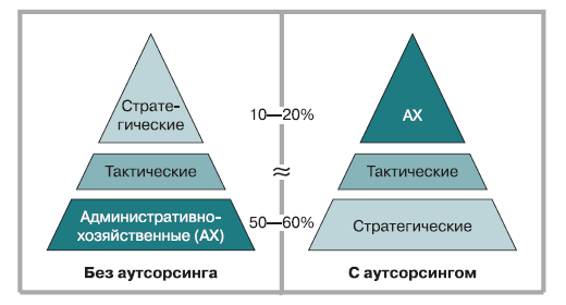 Аутсорсинг бизнес-процессов представляет передачу сторонней организации отдельных бизнес-процессов, которые не являются для предприятия основными, бизнес образующими. Из их числа на аутсорсинг могут быть переданы такие, как управление персоналом, бухгалтерский учет, маркетинг, реклама, логистика. На рисунке 9 показана структура бизнес-процессов предприятия с учётом аутсорсинга и без него. Так, без аутсорсинга 50-60% от общего числа бизнес-процессов предприятия приходится на административно-хозяйственные. Использование аутсорсинга позволяет увеличить долю стратегических процессов в компании[38].