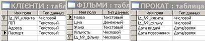 Хід роботи. 2. Використавши конструктор таблиць створити три таблиці з назвами фільми, прокат і клієнти