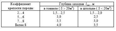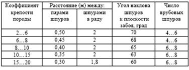 При заданной глубине заходки длина отбойных и контурных шпуров определяется коэффициентом использования шпуров и углом наклона их к плоскости забоя. Концы этих шпуров должны лежать в одной плоскости, перпендикулярной продольной оси выработки. Длина врубовых шпуров должна превышать на 10% длину остальных шпуров. Устья контурных шпуров располагают в 10-25 см (в работе 25 см) от проектного очертания выработки, а концы их должны находиться на проектном контуре. Отбойные шпуры располагают между врубовыми и контурными шпурами таким образом, чтобы на каждый шпур приходился примерно одинаковый объем взрываемой породы при условии достаточного ее дробления.