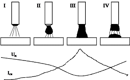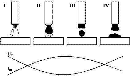 Из расплавленного электрода металл переносится каплями. От формы переноса металла сильно зависит качество сварных швов. При крупнокапельном переносе из-за малой площади контакта металла со шлаком недостаточно протекает легирование металла сварных швов. При этом также хуже формирование сварочных швов. При неустойчивом переносе металла, наблюдается не постоянное формирование шва и проявляется химическая неоднородность. Виды переноса металла 1. Крупно и мелко капельный перенос с короткими замыканиями дугового промежутка. Перенос характерен: сварка в СО2, возможен при РДС на короткой длине дуги.