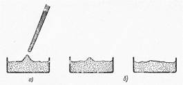 Рис. 1. Проверка пластичности шпатлевки: а — нормальной вязкости, б — жидкий состав, конус растекается По новой штукатурке фактурную окраску можно производить только после полного ее высыхания и подмазки всех дефектов. Если штукатурка обладает сильной тянущей способностью, следует загрунтовать поверхность 8%-ным раствором животного клея. По старой масляной окраске отделку производят после промывки поверхности водой с содой. Деревянные поверхности сначала олифят, подмазывают трещины и щели, заклеивают крупные трещины марлей или серпянкой, а затем наносят состав. Нанесенный состав обрабатывают различными приемами с помощью разнообразных приспособлений, чтобы придать ему ту или иную фактуру.