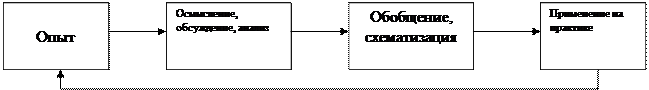 Рис. 2 Отправным моментом в естественном обучении, по мнению Девида А. Колба, является конкретный опыт. Он образует почву для наблюдения и осмысления (рефлексии), которые составляют фазу обучения. На основании наблюдения человек приходит к абстрактным (отстраненным от непосредственного опыта) представлениям и понятиям (третья фаза), выступающим в виде гипотез и проверяющимся в разнообразных ситуациях - воображаемых, моделированных и реальных (четвертая фаза - активное экспериментирование).