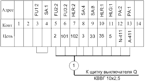 В распределительном устройстве в ячейке №8 находятся трансформаторы тока ТА.А и ТА.С, привод выключателя с его включающим YAC, отключающим YAT электромагнитами и вспомогательными контактами Q: 1 … Q: 5, автоматический выключатель SF3 и контактор КМ. На схеме рис.8 отображены все эти элементы, соединения между ними, ряд зажимов X, кабели, отходящие на панели щитов (управления, релейного и постоянного тока). Все проводники, соединяющие элементы привода включателя между собой и с рядом зажимов, показаны полностью и легко прослеживаются. Поэтому обозначения цепей показаны только у жил кабелей 1, 6, 3 и кабельных перемычек 4 и 5. У каждого кабеля указаны его марка, номер и адрес, куда он отходит. На схеме рис.9 показана часть панели №10 щита управления, на которой расположены элементы, относящиеся к рассматриваемой линии 10 кВ: резистор R1, R2, R6, амперметр РА, автоматические выключатели SF1 и SF2, переключатель SA, сигнальные лампы HLG, HLR и HLW, реле KCC и KCT. На той же схеме отображены ряд зажимов, соединения в пределах панели и кабели, отходящие к панели релейного щита и в распределительное устройство. Особенностью панели №10 является расположение на ее боковинах вертикального ряда зажимов и коробов для размещения проводов и жил контрольных кабелей. Использование конструкции панели для размещения на ней элементов нескольких присоединений (монтажных единиц) определяют характер выполнения схемы. Около каждого элемента кроме позиционного обозначения приводятся порядковый номер элемента и номер монтажной единицы, к которой он относится. Так, над условным графическим обозначением амперметра проставлено буквенно-цифровое обозначение, в числителе которого цифры 02 (номер монтажной единицы) и 04 (порядковый номер элемента в пределах данной монтажной единицы), а в знаменателе – РА (позиционное обозначение). Провода в пределах панели полностью не показаны, даны лишь изображения их концов, непосредственно примыкающих к выводам аппаратов и приборов и перемычек в пределах одного аппарата или прибора. Кроме того, применена встречная адресная маркировка, при которой у вывода одного аппарата указывается, к какому выводу какого аппарата или отходящий проводник, и в свою очередь у этого вывода, к которому подошел проводник, указывается вывод и аппарат, откуда проводник вышел. При этом обязательно приводится номер монтажной единицы. Так, у проводника, подключенного к выводу 4 переключателя SA, обозначение 0210-11 указывает, что второй его конец подключен к выводу 11 элемента 10 (реле KCC) монтажной единицы 02. При этом вначале приводится номер монтажной единицы 02, затем порядковый номер элемента 10, после чего через двоеточие номер вывода 11. У второго конца того же проводника обозначение 0209-4 указывает адрес первого конца: вывод 4 элемента 9 (переключатель SA) той же монтажной единицы 02. Если проводник отходит к ряду зажимов, адрес второго конца записывается с указанием номера монтажной единицы, знака и номера зажима. Так обозначение 02X: 19 у одного конца проводника, подключенного к выводу 1 переключателя SA, указывает, что второй его конец подключен к зажиму 19 ряда зажимов монтажной единицы 02. При монтаже цепей электроустановки на проводниках, отходящих от ряда зажимов, может проставляется два обозначения: одно указывает номер монтажной единицы и номер зажима, от которого отходит про