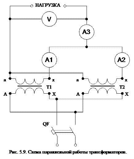 4.2. По схеме, изображенной на рисунке 5.9, соберите электрическую цепь. Правый маховик АТ, играющего в этом опыте роль активно-индуктивной нагрузки, должен быть повернут до упора по часовой стрелке; тогда при включении ток исследуемого трансформатора будет минимальным. 4.3. Подайте питание на первичные обмотки трансформаторов. 4.4. Постепенно увеличивая нагрузку, снимите показания амперметров и занесите их в таблицу 5.3 Журнала. Опыт следует завершить, как только ток одного из трансформаторов достигнет 5А. 4.5. Отключите питание лабораторной установки и по результатам опыта постройте на одном графике зависимости токов обмоток НН обоих трансформаторов от суммарного тока нагрузки. Определите, на сколько процентов недоиспользована установленная мощность недогруженного трансформатора. 5. Исследуйте параллельную работу трансформаторами с приблизительно одинаковыми значениями коэффициентов трансформации, но разными значениями напряжения короткого замыкания, для чего придерживайтесь следующих рекомендаций. 5.1. Выберите из трех трансформаторов два, удовлетворяющих условию, указанному в задании к опыту. 5.2. Повторите основные действия пунктов 4.2-4.5 и заполните таблицу 5.4 Журнала. Вопросы и задания для самопроверки. 1. Какие условия должны быть выполнены при включении трансформаторов на параллельную работу? 2. Невыполнение каких условий включения на параллельную работу проявляется уже на холостом ходе трансформаторов, а каких при работе под нагрузкой? 3. С какой точностью должны выполняться условия включения трансформаторов на параллельную работу? 4. Сравните условия включения на параллельную работу генераторов постоянного тока и трансформаторов. Можно ли провести аналогию между условиями параллельной работы этих машин? 5. Дополните рисунок 5.2 векторной диаграммой, иллюстрирующей работу трансформаторов под нагрузкой. 6. Объясните, используя рисунок 5.8, какой из трансформаторов следует считать источником, а какой потребителем уравнительного тока. 7. Можно ли подобрать коэффициент мощности нагрузки, чтобы токи двух трансформаторов с разными значениями коэффициента трансформации, включенных на параллельную работу, при изменении Кнг оставались одинаковыми? Ответ проиллюстрируйте векторной диаграммой. 8. Как выглядит векторная диаграмма для трансформаторов с разными значениями коэффициента трансформации, работающих параллельно на активно-индуктивную нагрузку, когда ток одного из них минимален? 9. Какой характер должна иметь нагрузка, при которой трансформатор с наибольшим значением коэффициента трансформации при параллельной работе оказывается более загружен? 10. Для чего нужно знать группу соединения обмоток трансформатора? Какими могут быть группы соединения однофазных и трехфазных трансформаторов? 11. Как определяют группу соединения обмоток однофазного трансформатора? 12. Как определяют группу соединения обмоток трехфазного трансформатора? 13. Из кожуха трансформатора выведено двенадцать концов. Опишите действия, с помощью которых можно выделить обмотки ВН и НН, соединить их в звезду и промаркировать выводы таким образом, чтобы получить соединение U/U-0. 14. При работе на общую активную нагрузку двух трансформаторов с одинаковыми значениями uк, но разными uкa и uкp какой из них будет более загружен? Будет ли этот же трансф