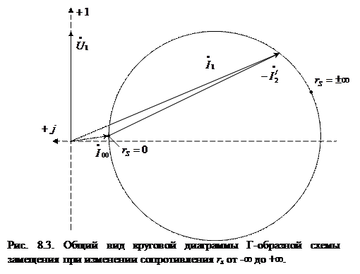 При переходе к Г-образной схеме замещения (рис. 8.2.б) перечисленные соответствия становятся менее явными, но структура модели асинхронной машины становится аналогичной структуре машины постоянного тока и синхронной машины, а именно, в ней выделяются две цепи: цепь тока возбуждения I00, создающего магнитный поток, и цепь силового тока I2'', взаимодействующего с потоком и создающего электромагнитный момент машины. В соответствии с Г-образной схемой ток I00 остается неизменным во всех режимах работы машины, а ток I2'', зависящий от скольжения, меняется в широких пределах, описывая дугу, называемую круговой диаграммой асинхронной машины. Особенность схемы замещения асинхронной машины, отличающая ее от схемы замещения простой электрической цепи, заключается в том, что изменяемое активное сопротивление На круговую диаграмму асинхронной машины могут быть нанесены шкалы скольжения, входной и выходной мощности, электромагнитного момента, коэффициента полезного действия, коэффициента нагрузки – всех величин, характеризующих режим работы машины. Перечисленные величины функционально связаны между собой, следовательно, с использованием круговой диаграммы могут быть построены графики рабочих характеристик асинхронной машины. Практическое применение круговой диаграммы ограничено случаями, в которых параметры машины можно считать постоянными. Несмотря на это, она имеет большое методическое значение, поскольку является максимально информативной моделью асинхронной машины, сочетающей в себе точность аналитического описания и наглядность графического представления взаимосвязи электрических и механических величин. В практике инженерных расчетов широкое применение находит упрощенная Г-образная схема замещения, для которой комплексный коэффициент