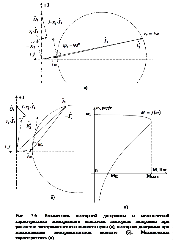 остаются неизменными. На рисунке 8.6.а) показано, что при очень большом действующем значении тока ротора, из-за взаимно-перпендикулярного расположения векторов Описанная зависимость электромагнитного момента от взаимного расположения и размера векторов тока и ЭДС объясняет вид механической характеристики асинхронного двигателя (рис. 8.6.в): при частоте вращения ротора равной нулю (s=1) развиваемый им момент мал и равен МП, с ростом частоты он увеличивается и достигает максимального значения ММАХ , при противовключении (s=±¥) момент стремится к нулю.