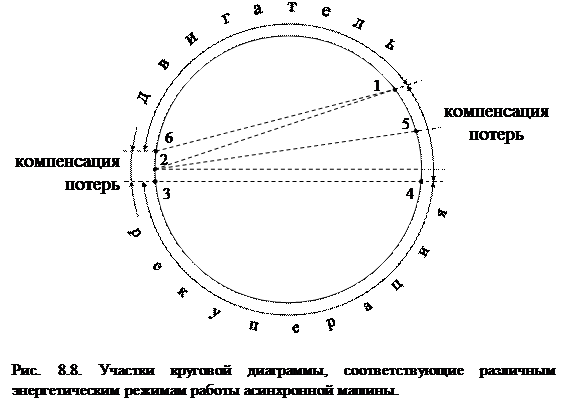 Круговая диаграмма асинхронной машины является, по существу, ее энергетической диаграммой. С точки зрения энергетики процессов, происходящих в рассматриваемом электромеханическом преобразователе, можно выделить следующие режимы работы асинхронной машины: двигательный, генераторный с рекуперацией энергии в сеть и режим компенсации потерь (рисунок 8.8). Принципиальное отличие этих режимов друг от друга заключается в следующем. В двигательном режиме мощности Р1, подведенной из электрической сети, оказывается достаточно, чтобы скомпенсировать все потери и обеспечить передачу некоторой мощности Р2 на вал, приводимому в движение механизму. То есть можно говорить о преобразовании электрической энергии в механическую энергию с некоторым коэффициентом полезного действия двигательного режима