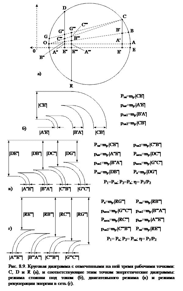 где Р1 – электрическая мощность при вычислении кпд в двигательном режиме и мощность на валу, если кпд вычисляется для режима рекуперации энергии в сеть; SDР – суммарные потери асинхронной машины в данном режиме. Причем, составляющие формулы (8.22) могут быть сняты с круговой диаграммы и подставлены в формулу в миллиметрах, без перевода в ватты.