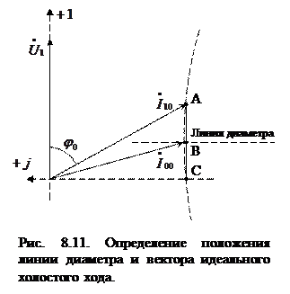 Для разделения потерь опыта холостого хода на механические и магнитные потери существует метод, подробно описанный в учебной литературе. Для упрощения построения круговой диаграммы в лабораторной работе можно сделать следующее допущение: механические потери составляют половину мощности, потребляемой асинхронной машиной в режиме холостого хода. Исходя из этого допущения, линия диаметра должна проходить через точку В – середину вертикального отрезка |AC|, заключенного между концом вектора и мнимой осью системы координат (рис. 8.11). На рисунке 8.11 показано, что пересечение линии диаметра с построенной впоследствии окружностью диаграммы даст положение конца вектора идеального холостого хода .