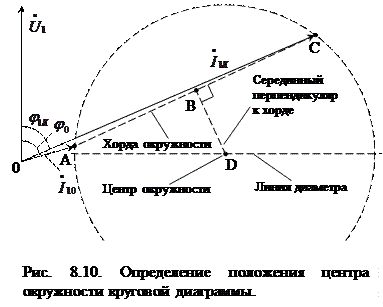 В формуле (8.18) r1 = 1, 6 Ом – активное сопротивление фазы обмотки статора. Данные, полученные по результатам опытов холостого хода и короткого замыкания, позволяют найти радиус и центр окружности упрощенной круговой диаграммы. Построение начинают с изображения в любом масштабе вектора сетевого напряжения На рисунке 8.10 показано, что между концами известных векторов – точками А и В – заключена хорда, серединный перпендикуляр к которой, восставленный в точке В, пересекает линию диаметра в центре D искомой окружности. Известно, что линия диаметра проходит через конец вектора идеального холостого хода