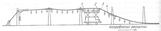 На перегоні автомотрису 1 зупиняють на початку анкерної ділянки біля першої перехідної опори, піднімають огорожі і готують до роботи монтажну стрілу 2. Підйом несучого тросу 3 на консоль цієї опори виконується поліспастом, який завішують з піднятого монтажного майданчика. Щоб трос не чіплявся за огорожу, автомотрису переміщують назад. Після закріплення тросу в сідлі автомотриса знову рухається уперед, поки несучий трос виявиться на рівні ролику монтажної стріли. Трос вкладається у широкий жолоб монтажного ролика і на всі наступні консолі піднімається до сідел за допомогою монтажної стріли. Коли автомотриса наближається до струнового зажиму, один з двох електромонтерів підхоплює ланкову струну 4 і піднімає вгору, пропускаючи через ролик. Цю операцію електромонтери виконують почергово. Третій постійно слідкує за тим, щоб струни не чіплялись за огорожу. Одночасно з підйомом несучого тросу можна розкочувати поверху контактний провід, який розміщується в одному з додаткових роликів. В цьому випадку до автомотриси чіпляють розкочувальну платформу. Анкіровку контактних проводів виконують з поворотного монтажного майданчика. Склад бригади при цьому збільшується на 1-2 електромонтерів, які підгальмовують барабани з проводом і приймають участь у монтажу анкіровки. При виконанні робіт на перегоні у перше «вікно» несучий трос розкочують на узбіччя шляху, а друге «вікно» використовують для підйому його монтажною стрілою. В наступні «вікна» один монтажний поїзд продовжує піднімати несучий трос, а інший виконує розкочування контактного проводу. Витяжку і анкіровку несучого тросу і монтаж струн можна виконувати на протязі всього робочого дня незалежно від руху поїздів. Ефективність комбінованого методу збільшується при збільшенні числа монтажних поїздів, що одночасно працюють на одному або декількох суміжних перегонах.