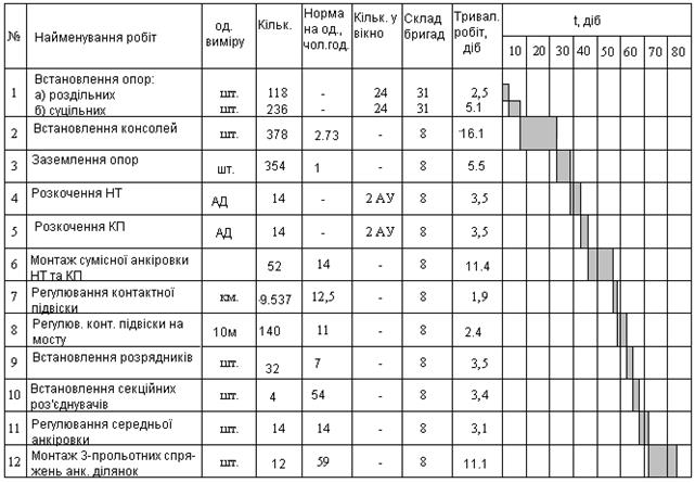 При виробництві будівельно-монтажних робіт на календарний графік впливають два основні чинники: 1. час, за який необхідно виконати поставлену задачу; 2. штат вільних співробітників, який є в наявності в даний момент часу. Оскільки зараз важливу роль грає швидкість виконання робіт, краще буде, якщо декілька бригад виконуватимуть монтаж і будівництво пристроїв контактної мережі одночасно. Бригади, що при цьому звільнилися, приступатимуть до інших видів робіт. Календарний графік виконання будівельних і монтажних робіт представлений у вигляді таблиці 8.1.