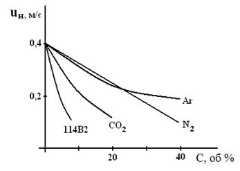 Рисунок 5. Влияние концентрации разбавителей и хладона 114В2 на скорость распространения пламени в пропано-воздушной смеси (a = 1.15)