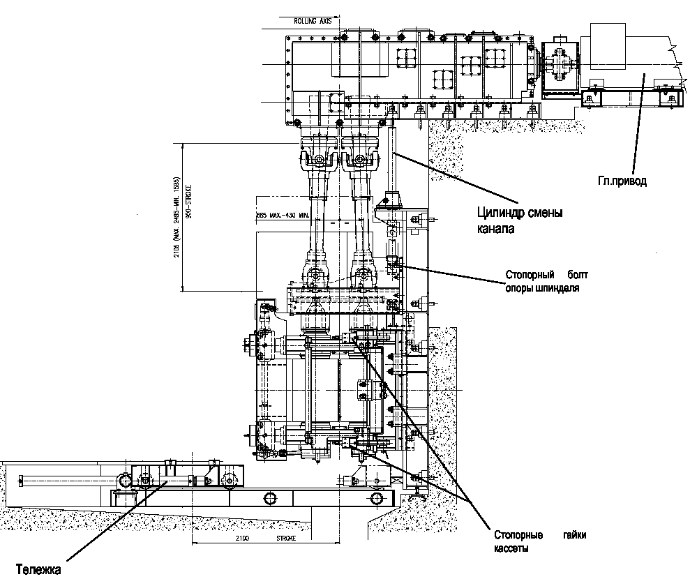 Черновые клети стана «170» - это двухъярусные, низкой посадки клети с кассетами. Содержание кассет – это валки, станины, нажимное устройство, каркас станины и контейнер, как поддержка для кассеты. Прокатное усилие воздействует только через шпиндели нажимного устройства, которые в свою очередь закрывают главное направление, реализуя низкое усилие нажима. Прокатные клети черновой группы состоят из горизонтальных клетей типа «DOM», и вертикальных клетей типа «DVM». Валки клетей имеют несколько каналов, которые могут быть идентичны или с разными формами профиля, что зависит от конкретно выполняемой работы. Кассеты и посадочное основание клети перемещаемые, посредством гидравлических приводов, для настройки необходимых каналов при формировании прокатной линии. Для горизонтальных клетей, каналы позиционируются через гидравлику, для вертикальных клетей каналы сменяются при помощи гидравлического двигателя, приводимого в действие винтовыми домкратами. В случае неисправности канала или изменения размера профиля канала, вследствие износа, клеть может быть быстро позиционирована на другой канал. Имеется возможность ручной настройки опорных брусков, поддерживающих направляющие устройства, на входе и выходе клети. Зазор между валками может быть настроен с помощью гидравлического привода, встроенного в кассету. Нажимное устройство реализовано как замкнутый контур с регулированием позиционирования по обратной связи; независимый импульсный генератор, встроенный также в каждую кассету, генерирует импульсы обратной связи по текущей позиции. Верхняя и нижняя станины симметрично позиционированы, так как шпиндели нажимного устройства выполнены с лево – и правосторонней резьбой, линия прокатки всегда постоянна. Ось нижнего валка зафиксирована. Ось верхнего валка может перемещаться для позиционирования верхнего канала с нижним. Настройка осей валков полностью ручная, посредством системы червячной передачи, с панели оператора. Водяной распылитель установлен внутри каждой кассеты, для охлаждения валков холодной водой. Водяной распылитель позиционируется вручную. Предусмотрено ручное и автоматическое сопровождение для средств снабжения контейнера клети. При ручном сопровождении, средства снабжения должны быть вручную разъединены, и соединены во время цикла смены кассеты. Для смены кассеты в автоматическом режиме (AUTO – mode), предусмотрена автоматическая соединительная плита со всеми электрическими соединениями и подключениями системы текучих сред.