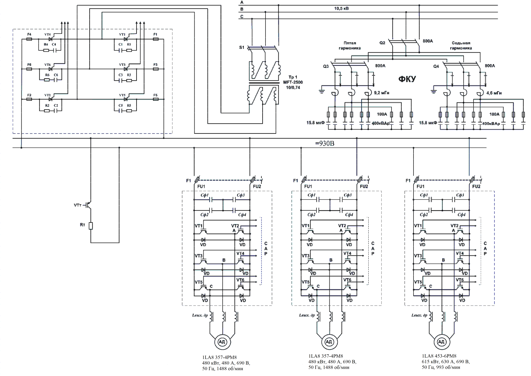 В соответствии с выбранным оборудованием на рисунках 4.1 и 4.2 представлена упрощённая схема силовой части электропривода, вспомогательных электроприводов и датчиков. Силовая часть выпрямителя собрана по трёхфазной мостовой схеме выпрямления на базе тиристоров. Тиристоры мостов защищаются быстродействующими плавкими предохранителями. Для снятия перенапряжений при коммутации тиристоров используются RC–цепи, включённые параллельно тиристорам. Выпрямитель подключается к сети переменного тока С выходных шин =930В выпрямителя запитаны инверторы черновых клетей через автоматические выключатели. Непосредственно с каждого инвертора запитан свой двигатель. Обмотки двигателей напрямую подключаются к клеммникам инверторов. Система регулирования автономных инверторов с широко импульсной модуляцией построена по принципу векторного управления. Вентиляция выпрямителя и инверторов принудительная.