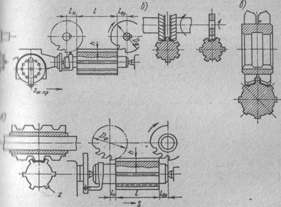 Рис. 3. Способы фрезерования шлицев валов: а - дисковой фасонной фрезой; б —двумя фрезами; в — двумя дисковыми специальными фрезами; г — шлицевой червячной фрезой. Фрезеровать шлицы можно способом, изображенным на рис. 3, б, позволяющим применять более дешевые фрезы, чем фасонные. Более производительным способом является одновременное фрезерование двух шлицевых канавок двумя дисковыми фрезами специального профиля (рис. 3, в). Чистовое фрезерование шлицев дисковыми фрезами производится только в случае отсутствия специального станка или инструмента, так как оно не дает достаточной точности по шагу и ширине шлицем, Более точное фрезерование шлицев производится методом обкатки при помощи шлицевой червячной фрезы (рис. 3, г). Фреза помимо вращательного движения имеет продольное перемещение вдоль оси нарезаемого вала. Этот способ является наиболее точным и наиболее производительным. Определение основного времени в этом случае производится по формуле: