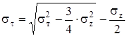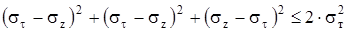 Решение задачи, когда на обсадную трубу совместно действует и осевая сила, и боковое давление имеет несколько вариантов. При рассматриваемой схеме нагружения в теле возникает сложное напряженное состояние. Можно воспользоваться одной из теорий прочности, найти эквивалентное напряжение, и, приравняв его пределу текучести, решить полученное уравнение относительно предельного давления. В наибольшей степени для этого подходит энергетическая теория прочности. Согласно этой теории моменту перехода из упругого состояния в пластическое соответствует равенство между удельной потенциальной энергии формоизменения при сложном нагружении и одноименной энергией при простом растяжении. Условие прочности при этом записывается: