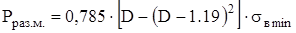 Расчет на растяжение колонн труб с резьбой трапецеидального профиля производят по разрушающей нагрузке, наименьшей из подсчитанных, исходя из условия разрушения по телу трубы в опасном сечении, условия выхода резьбы из сопряжения, вследствие уменьшения поперечных размеров трубы от удлинения при растяжении, и условия разрушения по муфтовой части соединения в опасном сечении. Разрушающую нагрузку по телу трубы в опасном сечении определяют по формуле: