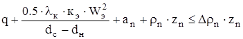 Чтобы при спуске не было поглощений, необходимо ограничивать гидродинамическое давление, которое при спуске колонны складывается из двух компонентов: одного - зависящего от скорости, которую приобрела жидкость к концу предшествовавшего момента времени, и второго - инерционного, зависящего от ускорения движения жидкости в рассматриваемый момент. Так при турбулентном режиме течения это условие можно записать, как: