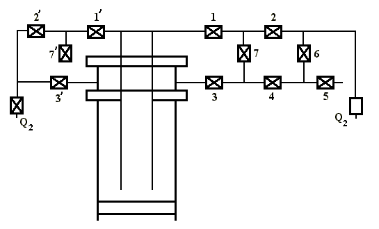 Под способами повторного цементирования понимают исправительные способы, применение которых вызвано необходимостью проведения ремонтных работ в результате обнаружения течи, нарушения герметичности колонны, или поступления пластовых вод в скважину через отверстия перфорации вместе с пластовым флюидом. Эти способы сводятся к транспортированию цементного раствора к месту потери герметичности. Наиболее широко используется в этом случае метод цементирования под давлением. В некоторых случаях цементный раствор продавливают по трубам малого диаметра. Трубы поднимает, промывает буровым раствором, и после затвердевания цементного раствора цементирование считается оконченным. Цементный камень, полученный таким способом, называется цементным мостом. Для установки цементных мостов при РИР широко используется способ Байдакова Н. К. Сущность этого способа заключается в следующем. Цементный раствор закачивают по трубам через задвижки 1 и 2, 1 и 2 при открытых задвижках 3, 4 и 5 (рис. 17.1). Задвижки 6 и 7, 71 и 31 закрыты. Прокачиваемый в скважину цементный раствор вытесняет находящуюся там жидкость, которая выходит из скважины через задвижки 3, 4 и 5. Для предотвращения подъема цементного раствора в пространство меду трубами в момент, когда цементный раствор, не доходя до башмака спущенных в скважину труб, закрывают задвижки 4 и 5. После этого продавливают раствор в пласт через нарушения колонны. При обратной промывке остатки цементного раствора вымывает буровым раствором или водой, которые закачивают в скважину через задвижки 6, 4, 3, 31. Причем задвижки 2, 21 закрыты. Жидкость выходит из скважины через спущенные трубы и сбрасывается через задвижки 7 и 71.