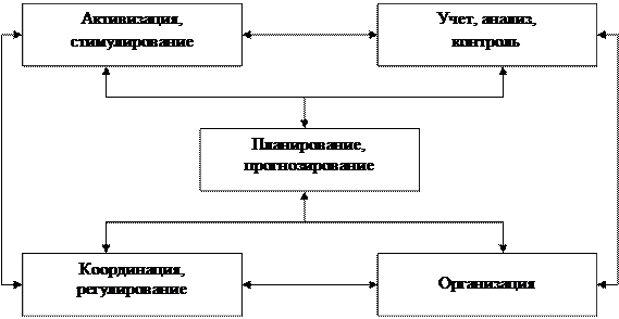Каждая функция характеризуется присущим ей технологическим процессом обработки информации и способом воздействия на управляемый объект. Функция управления всегда направлены на достижение целей управления. Поскольку цель управления формируется в рамках функции «планирование-прогнозирование», можно сказать, что данная функция в системе функций управления предприятием является центральной. Функции управления в своей основе объективны и являются формами реализации управленческих отношений, через которые, в свою очередь, реализуются требования экономических законов развития производства. Поэтому процесс управления выступает как объективно предопределенная система функций, которая носит название управленческого цикла, а сами функции называются стадиями управленческого цикла. Функция планирования служит основой для принятия управленческих решений и представляет собой управленческую деятельность, которая предусматривает выработку целей и задач управления производством, а также определение путей реализации планов для достижения поставленных целей. Прогнозирование в управленческом цикле предшествует планированию и ставит своей задачей научное предвидение развития производства, а также поиск решений, которые обеспечивают развитие производства в оптимальном режиме. Поскольку прогнозирование всегда предшествует планированию, его можно рассматривать как подфункцию планирования. Организация как функция управления – это деятельность, направленная на создание или развитие структуры хозяйственной системы. В зависимости от объекта различают организацию производства, труда и управления. Организация управления включает регламентацию отдельных элементов процесса управления (стадий управленческого цикла, процедур и операций управления), установление времени выполнения работ, состава исполнителей, прав, ответственности, технического и информационного обеспечения и т.п. Координация заключается в обеспечении необходимой (предусмотренной проектом организации) согласованности действий работников. Цель координации – устранить параллелизм и дублирование в работе. Функция регулирования состоит в сохранении режима функционирования хозяйственной системы. В силу различных причин производство может отклоняться от заданных параметров. В этих условиях путем регулирования устраняются отклонения и обеспечивается нормальное протекание производственных процессов. С помощью учета осуществляется сбор информации о состоянии хозяйственной системы. Учет служит базой для анализа – комплексного изучения производственно-хозяйственной деятельности с целью контроля и повышения эффективности функционирования производства путем выявления и мобилизации имеющихся резервов. Роль контроля как функции управления обусловлена тем, что он является средством осуществления обратных связей в системе управления. Посредством контроля проверяется выполнение принятых плановых решений и оцениваются их последствия. Активизация – это интенсификация трудовой и общественной деятельности работников на основе повышения творческого потенциала личности и коллектива. Активизация достигается комплексным применением методов морального и материального стимулирования. В основе материального стимулирования лежат материальн