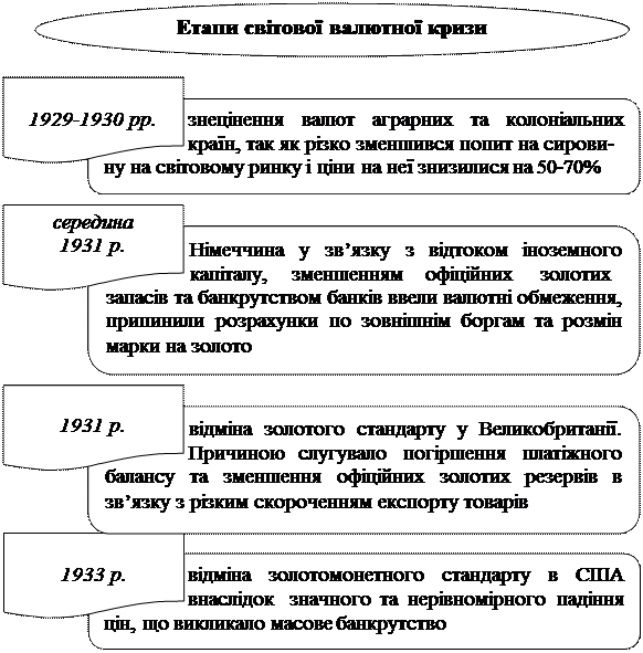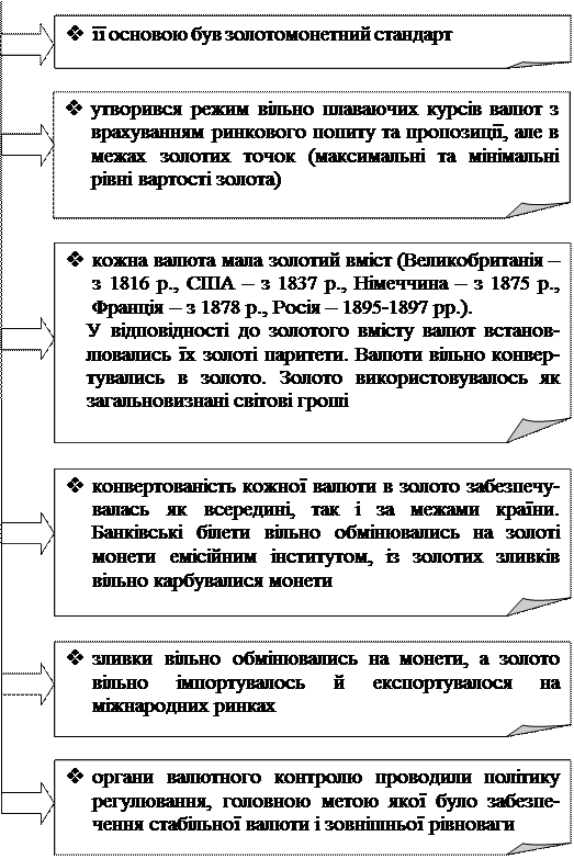 Поступово золотий стандарт (в золотомонетній формі) вичерпав себе, так як не відповідав масштабам збільшення господарських зв’язків та умовами регулюємої ринкової економіки. Перша світова війна відзначилась кризою світової валютної системи. Золотомонетний стандарт перестав існувати як грошова та валютна системи.