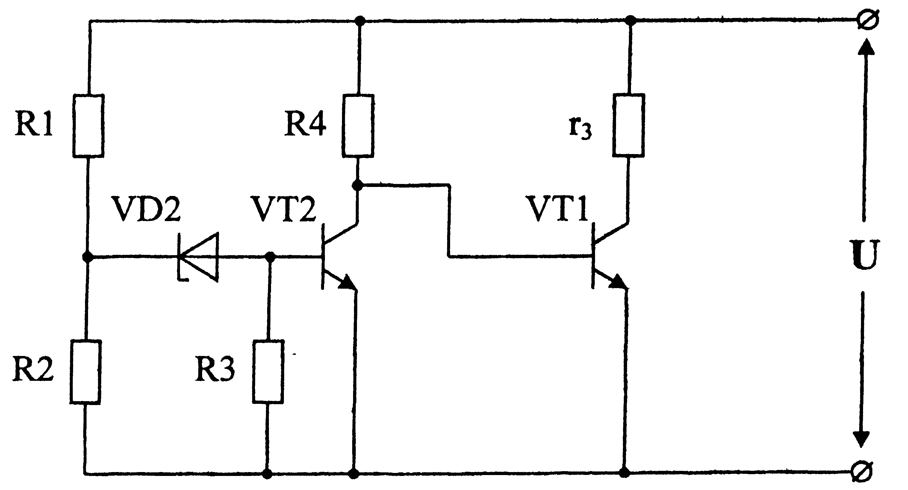 3.2 Розрахунок безконтактного регулятора напруги Розрахувати безконтактний регулятор напруги (РН), схема якого наведена на рисунку 12. Згідно із завданням треба визначити параметри (опір) пасивних елементів схеми (резисторів R1...R4) та режими кіл регулятора напруги (струми в колах схеми у стані спрацьовування За вихідні дані визначено: напруга спрацьовування В активних елементах схеми обрано кремневі транзистори n-p-n типу VT1 (КТ315), VT2 (КТ805) для всіх варіантів завдання. Транзистори характеризуються наступними параметрами VT1(VT2): потенціальні бар'єри емітерних переходів Таблиця 3.2 Вихідні дані для розрахунку регулятора напруги