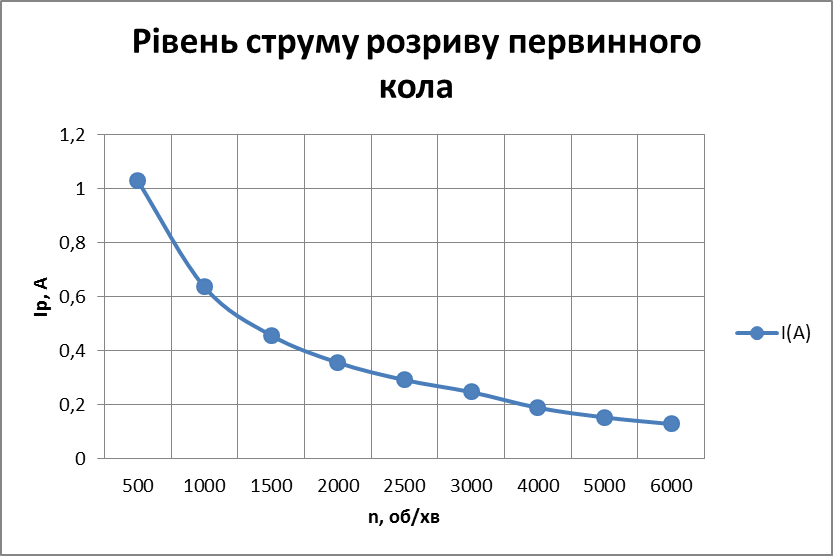 Рисунок 3.4 Залежність струму розриву від частоти обертання колінчатого вала