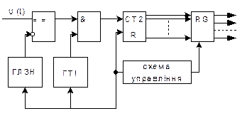 Рисунок 1.2 Схема послідовного АЦП з одиничним наближенням (ГЛЗН – генератор лінійно змінюваної напруги; ГТІ – генератор тактових імпульсів; СТ – лічильник; RG – регістр; & - схема збігу)